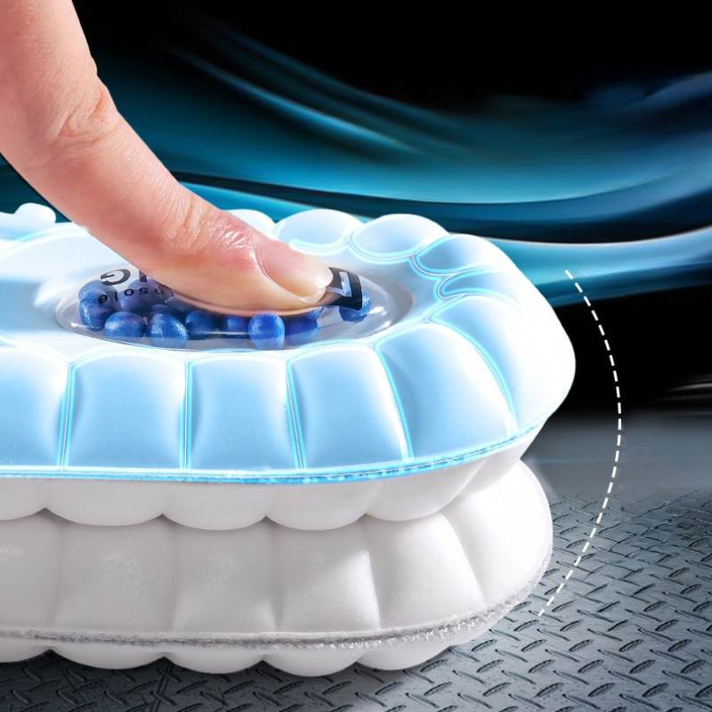 Microesferas massageadoras que estimulam a circulação e aliviam a pressão ao caminhar.